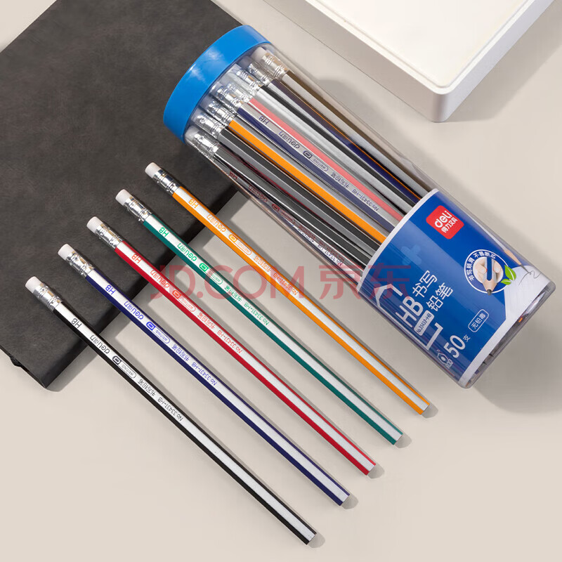 商品相册:得力(deli)50支HB铅笔经典彩色抽条六角杆铅笔带橡皮头学生书写素描绘图铅笔33433-HB学生开学文具第