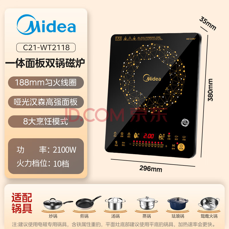商品相册:美的(Midea)电磁炉电陶炉火锅炉匀火智能定时多档火力爆炒大功率C21-WT2118(标配汤锅+炒锅)第