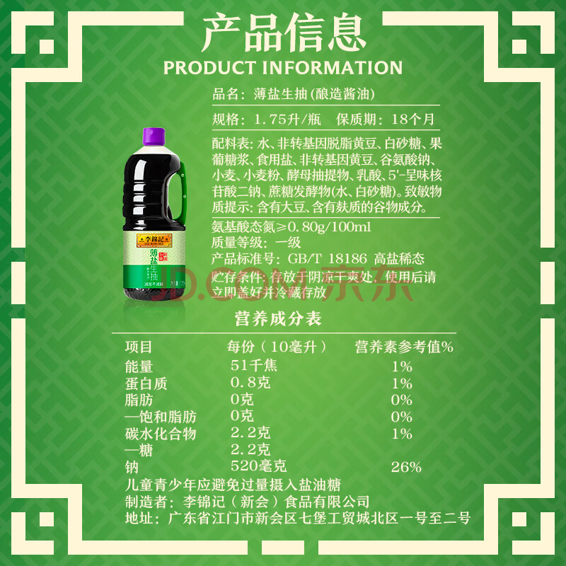 商品相册:李锦记 薄盐系列 薄盐生抽1.75L【减盐 一级】健康更安心 酱油调味第