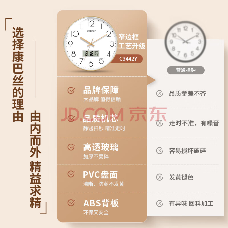 商品相册:康巴丝(Compas)挂钟客厅钟表 万年历简约石英钟表挂墙时钟 C3242Y 轻奢金色 28cm第