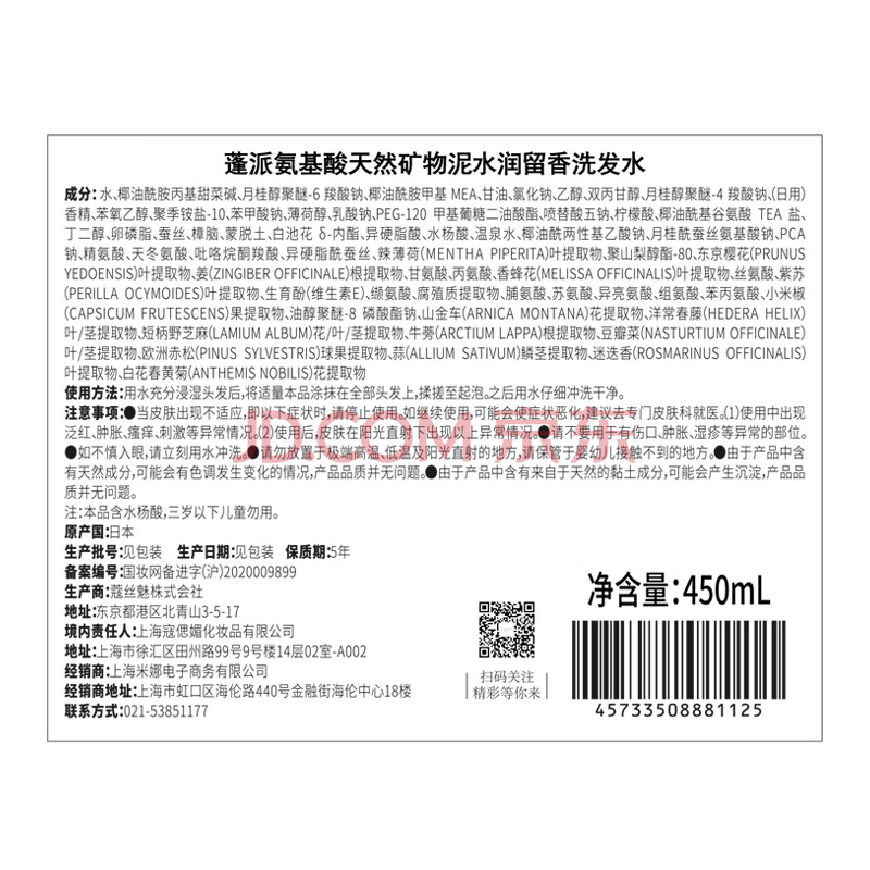 商品相册:蓬派(CLAYNAL)洗发水滋润呵护樱花香氛洗头膏450ml男女通用氨基酸无硅油 第