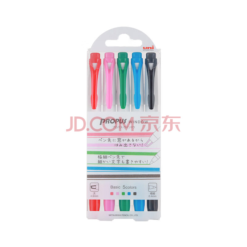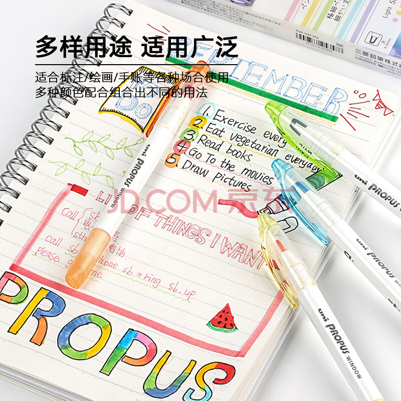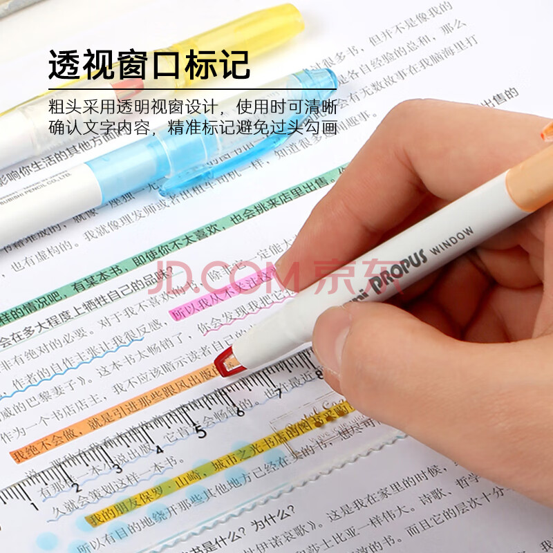 商品相册:uni三菱 双头荧光记号笔 学生作业手账绘画标记笔彩色笔 细0.4mm粗4mm PUS-103T 5色基础色套装第