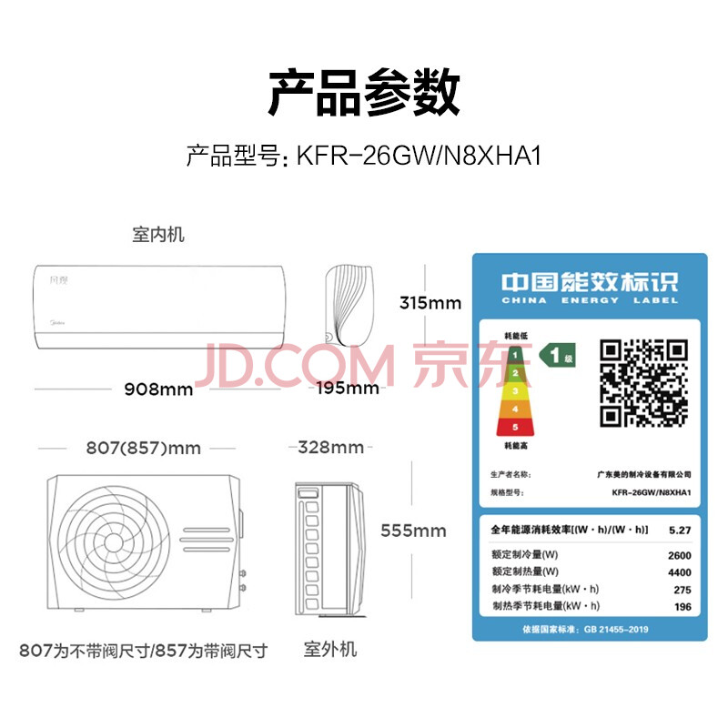 商品相册:美的 Midea新一级 风观 大1匹智能变频加大导风板冷暖挂机 KFR-26GW/N8XHA1第