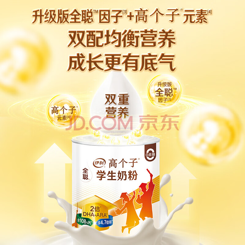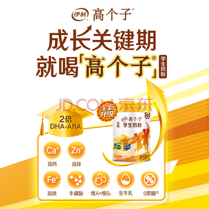 商品相册:伊利高个子学生奶粉 儿童奶粉 全聪高钙高锌高铁牛磺酸 DHA+ARA 900g第1张/共8