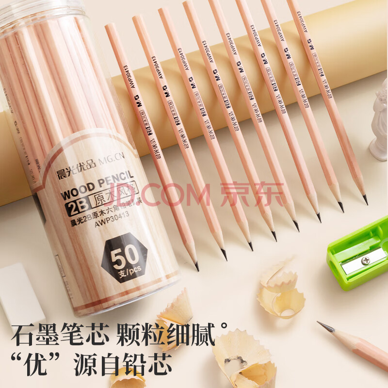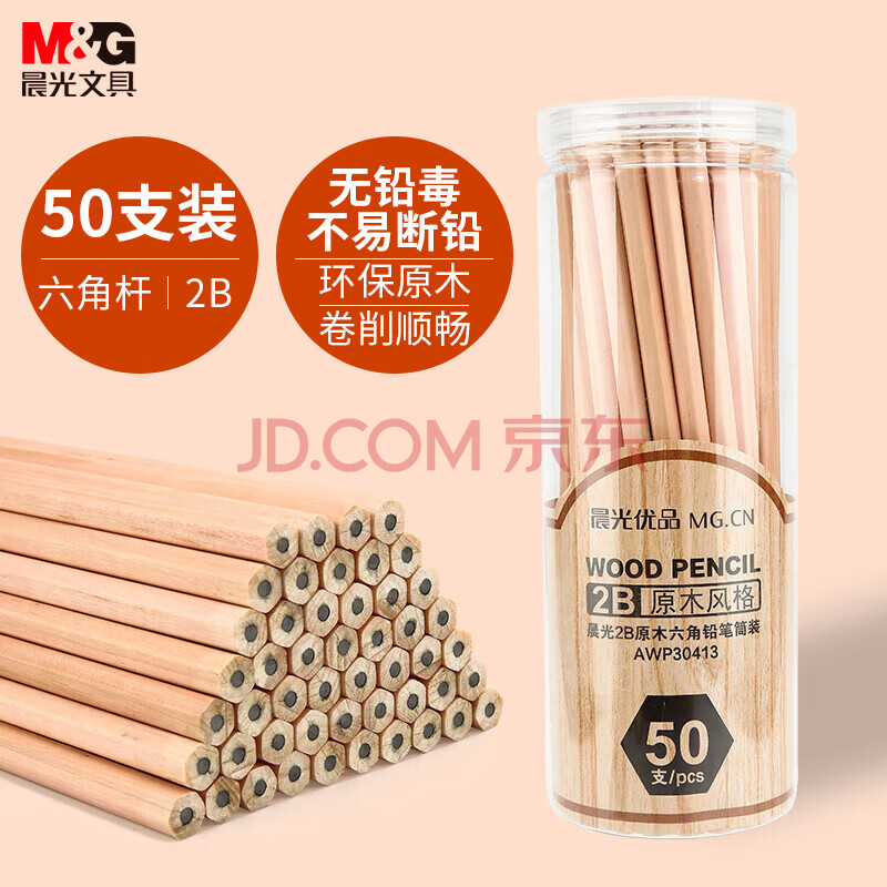 商品相册:晨光(M&G)文具2B铅笔50支 原木六角木杆铅笔 学生开学涂卡书写美术素描绘图木质铅笔AWP30413第