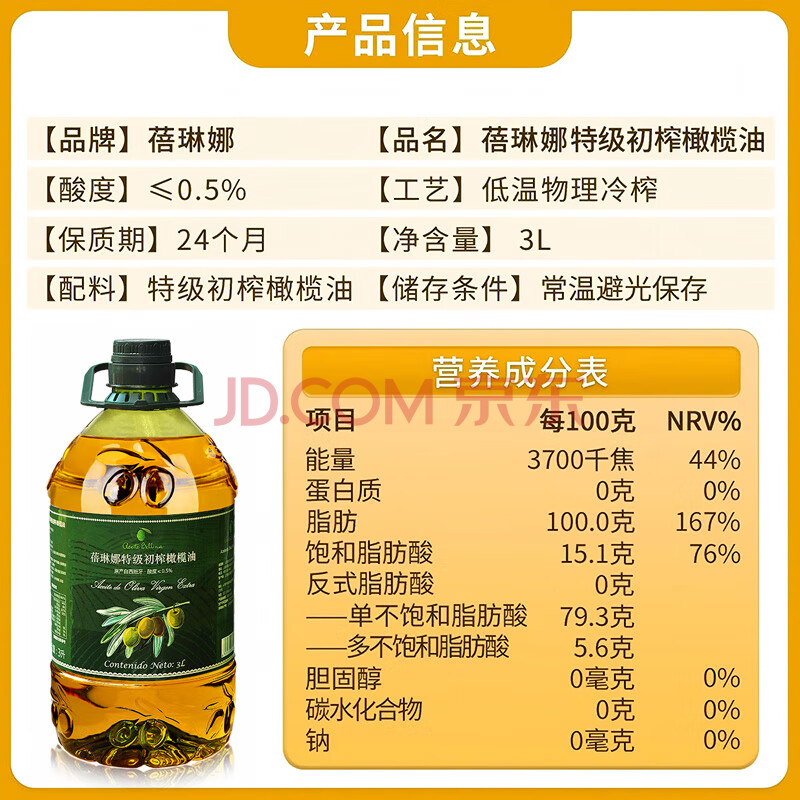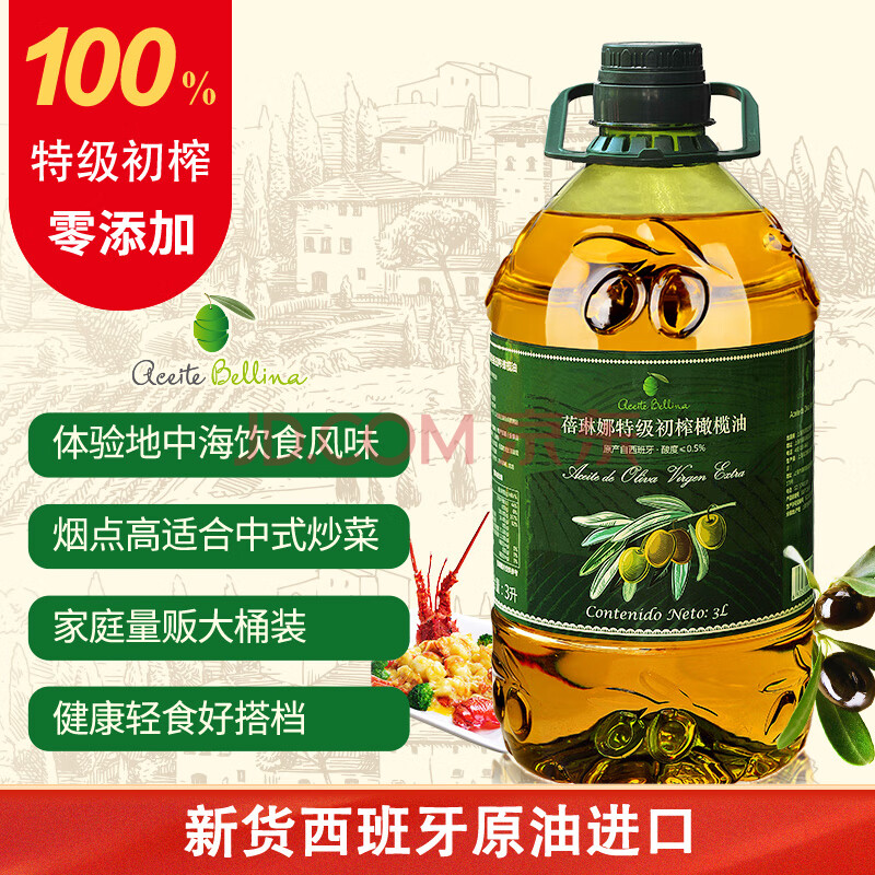 商品相册:蓓琳娜(BELLINA)【保真橄榄油】欧洲原油进口100%特级初榨橄榄油3L家食用健康炒菜第