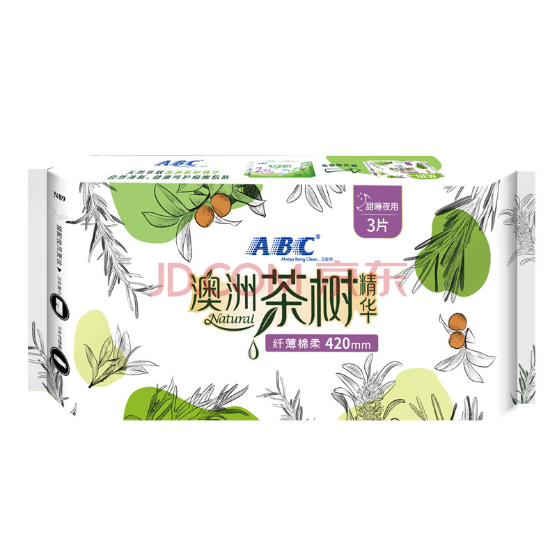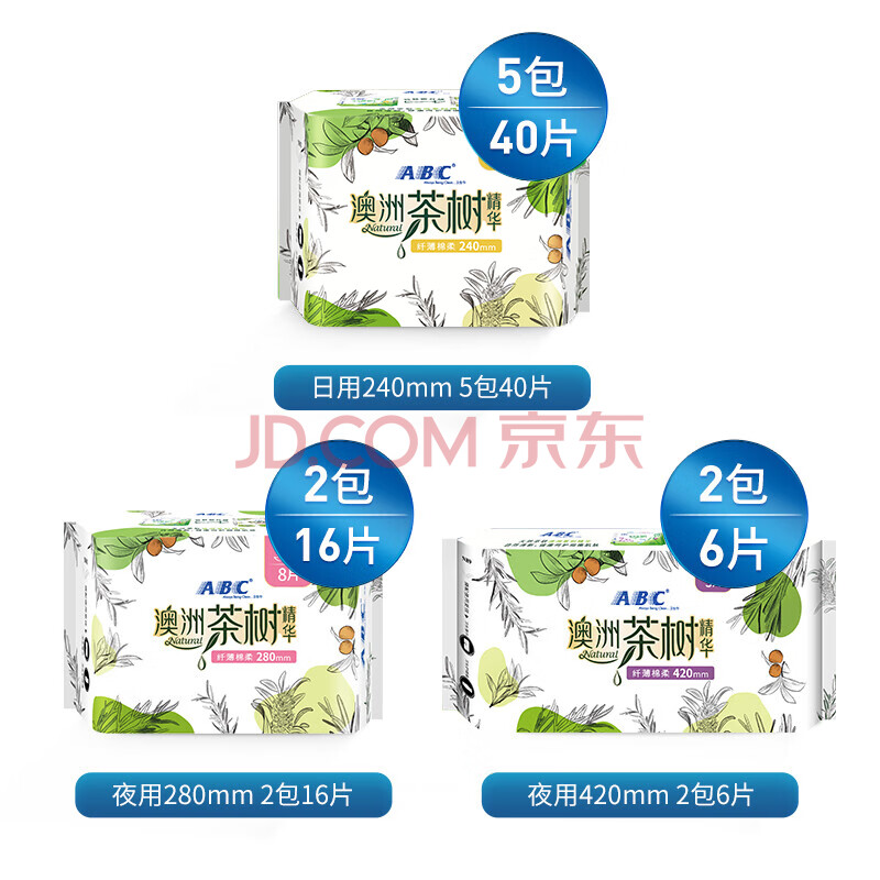 商品相册:ABC澳洲茶树精华超薄透气日夜卫生巾套装京东自营姨妈巾9包62片第