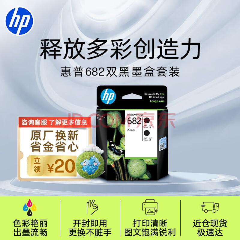 商品相册:惠普(HP)682原装黑色双支装墨盒 适用hp 2336/2775/2776/2777/2778/2779/4175/4178/6078/6478打印机第