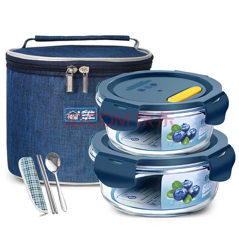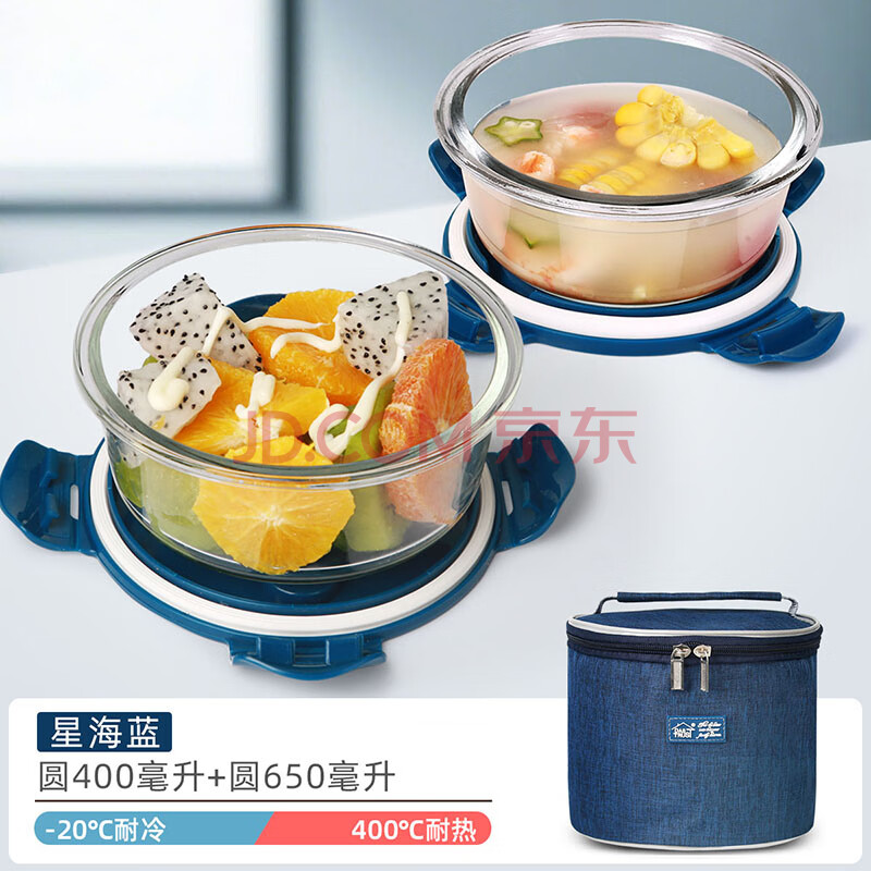 商品相册:创得耐热玻璃保鲜盒微波炉饭盒上班族便当盒星海蓝圆400+650+包+餐具第