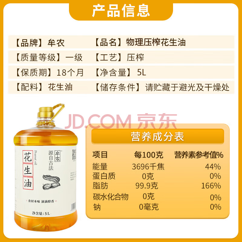 商品相册:牟农 【保真花生油】物理压榨 花生油5L 压榨一级 烟台恒邦出品第