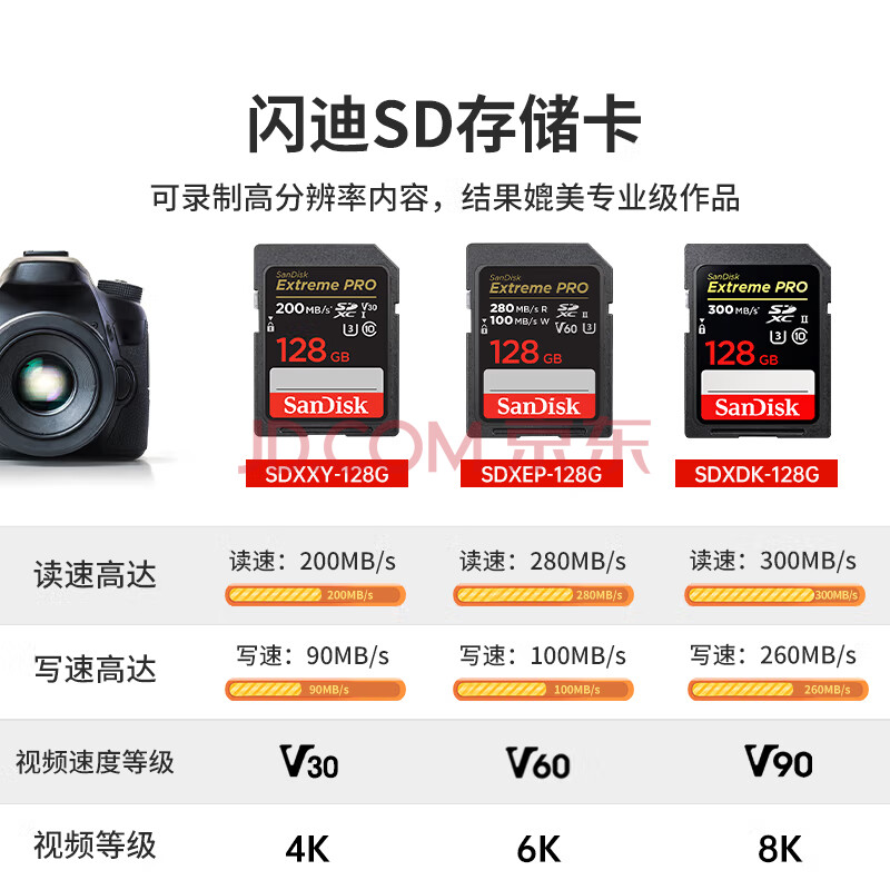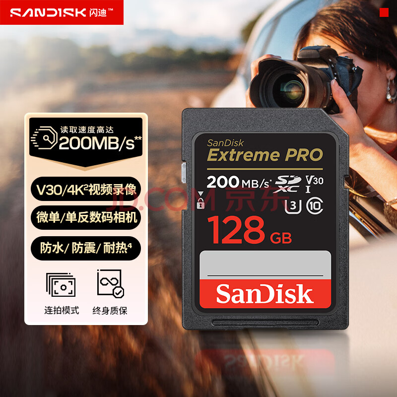 商品相册:闪迪(SanDisk)128GB SD内存卡 4K V30 U3 C10 相机存储卡 读速200MB/s 写速90MB/s 微单/单反相机内存卡第