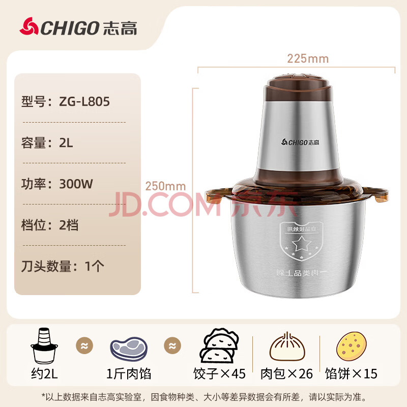 商品相册:志高(CHIGO)绞肉机家用 绞馅机不锈钢电动多功能料理辅食机搅拌机饺子肉馅碎肉机小型蒜蓉机ZG-L805约2L第1张/共8