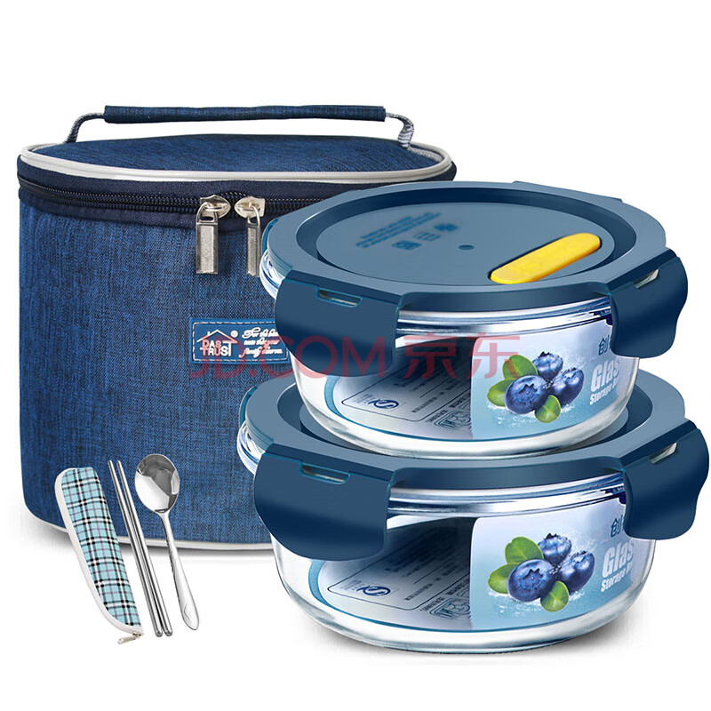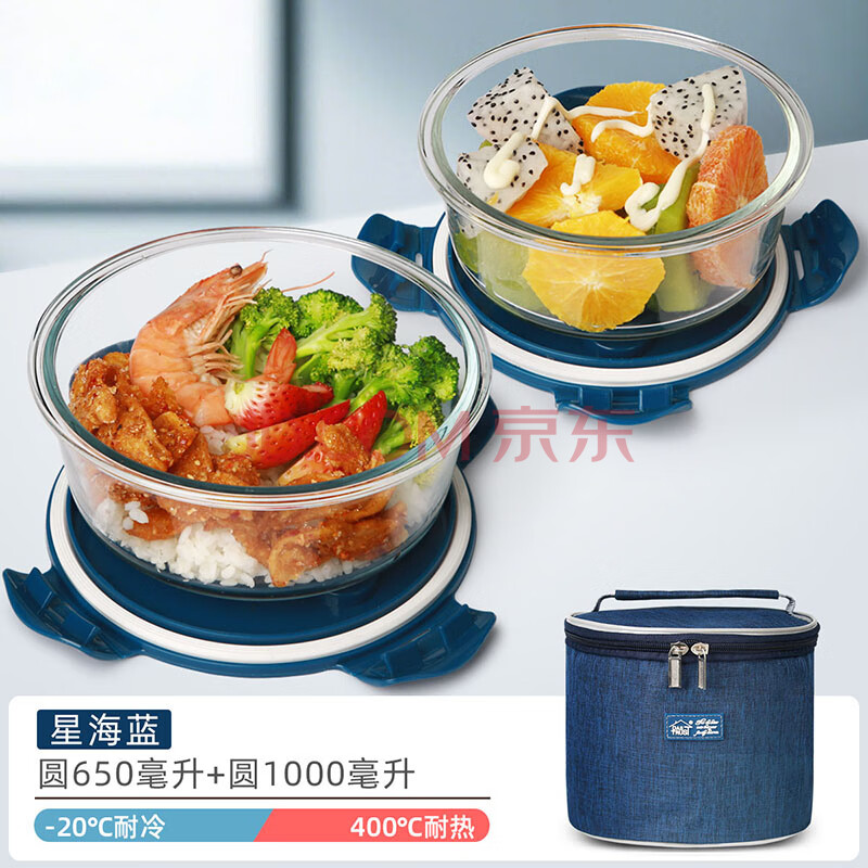 商品相册:创得耐热玻璃保鲜盒 微波炉饭盒上班族便当盒星海蓝650+1000ml+包餐具第