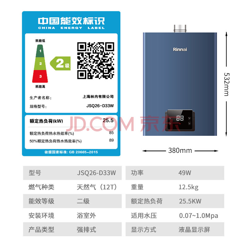 商品相册:林内(Rinnai) 13升燃气热水器家用天然气语音智控恒温防冻大水量智能生态RUS-13QD33W(JSQ26-D33W)**第1张/共4