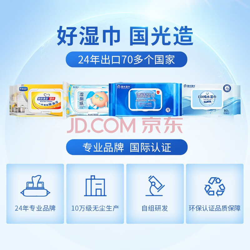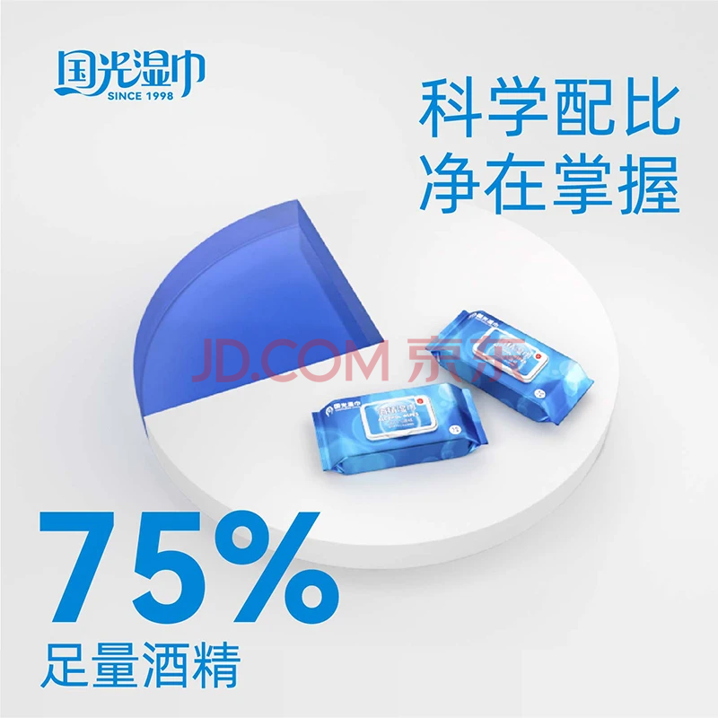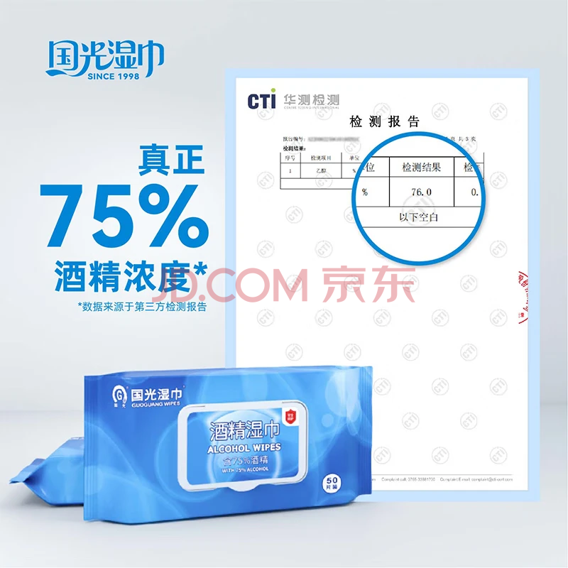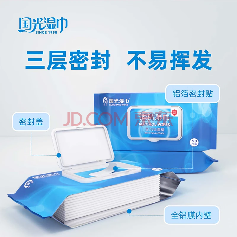 商品相册:国光 75%酒精湿巾 50抽*3包 杀菌率99.9%卫生消毒湿纸巾 第