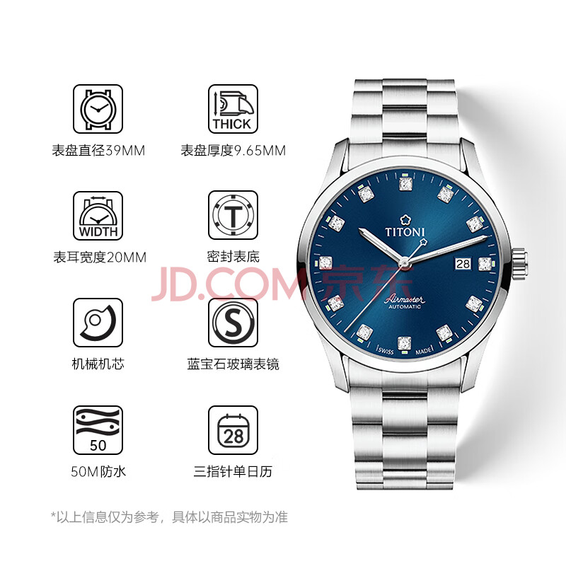 商品相册:梅花(Titoni)瑞士手表男士自动机械表 进口腕表 空霸系列 钢带39mm83743-S-656第