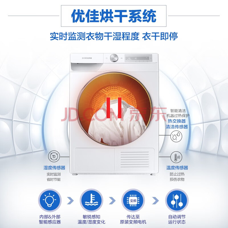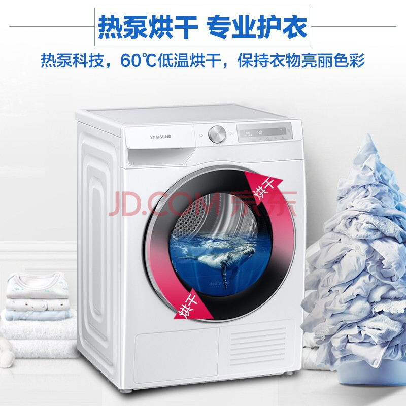 商品相册:三星(SAMSUNG)滚筒烘干6000T 9KG热泵柔烘蒸汽除菌AI操控大桶径设计月光白 DV90T6420LH第1张/共5