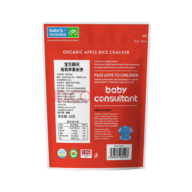商品相册:宝贝顾问有机米饼韩国原装进口出游宝宝零食儿童零食磨牙棒苹果味20g第