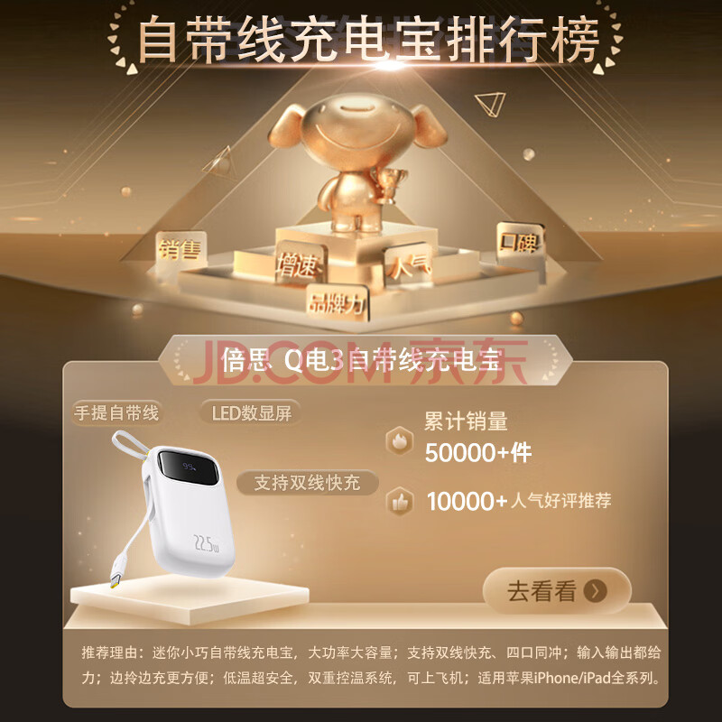商品相册:倍思【国标3C认证】充电宝20000毫安22.5W自带Type-C线移动电源可上飞机适用于苹果华为小米手机第1张/共7