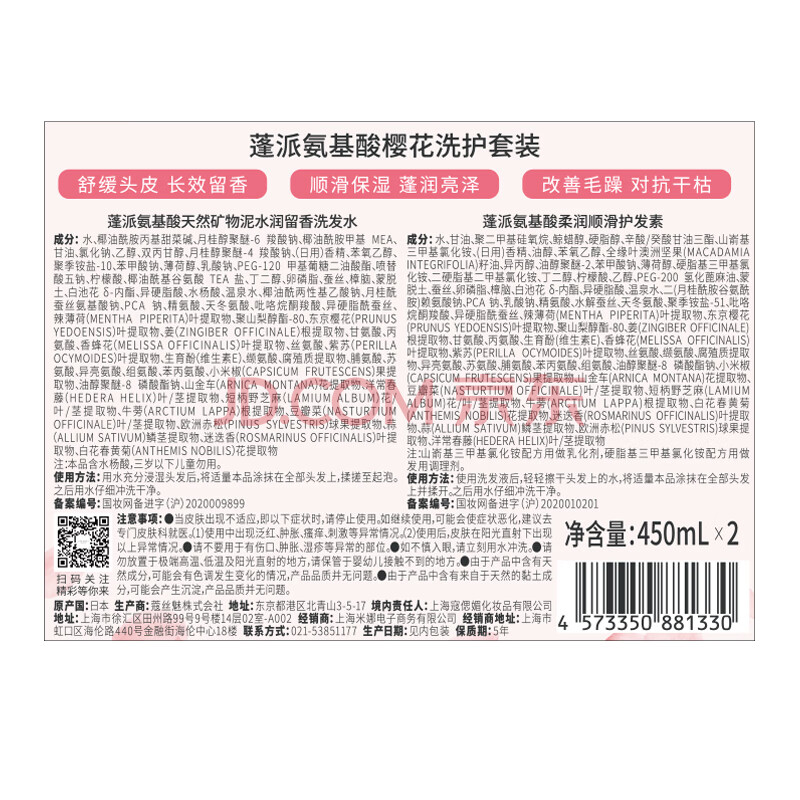 商品相册:蓬派(CLAYNAL)滋润呵护樱花香氛洗护套装礼盒洗发水450ml+护发素450ml第