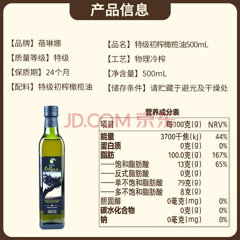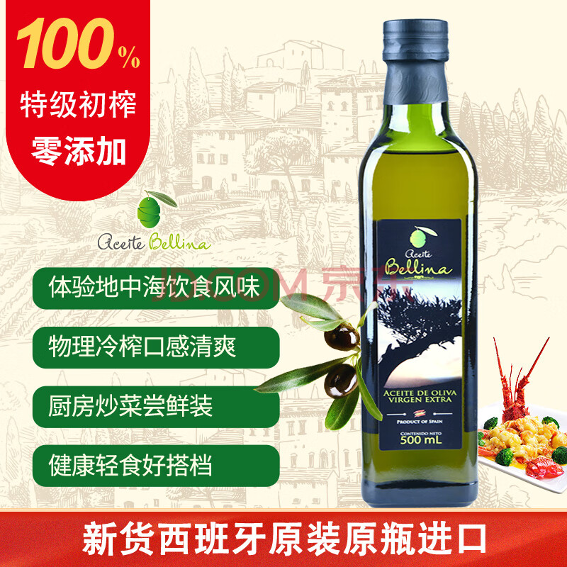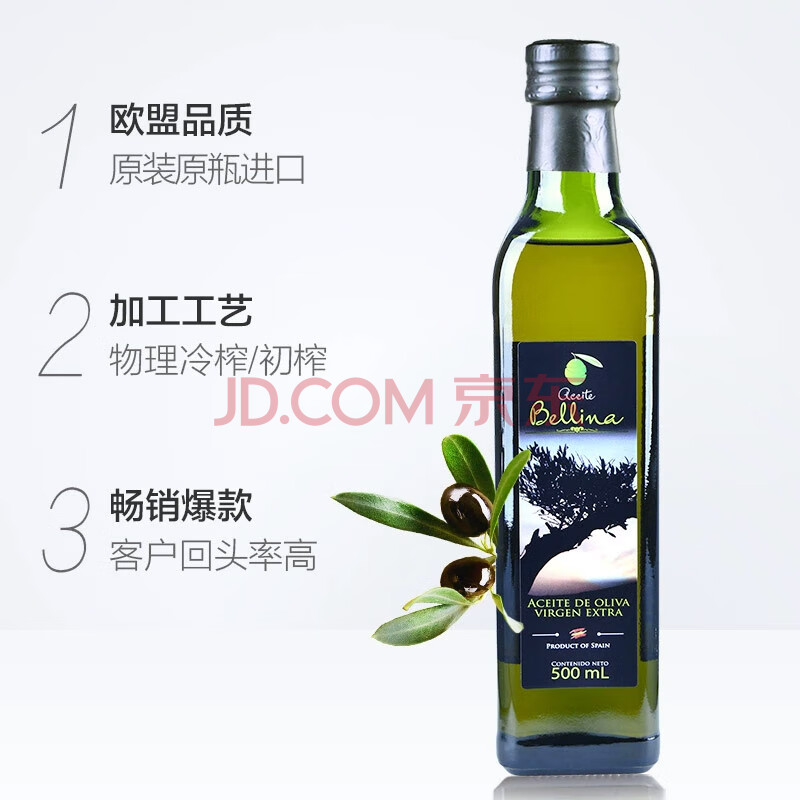 商品相册:蓓琳娜(BELLINA)【保真橄榄油】欧洲原装进口100%特级初榨橄榄油500ml炒菜食用油第