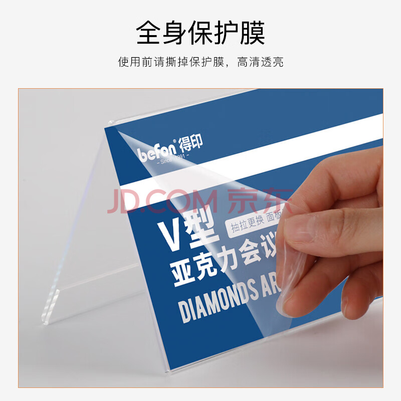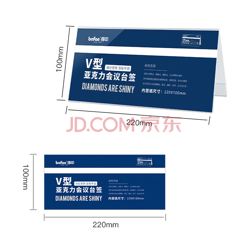 商品相册:得印(befon)亚克力桌签桌牌席卡架 座位牌 台卡台签 双面V型会议牌桌面展示卡广告展示牌220*100mm10个装7744第