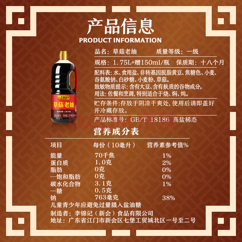 商品相册:李锦记 草菇老抽1.9L(1.75L加送150ml) 0添加防腐剂 专业红烧 酱油第