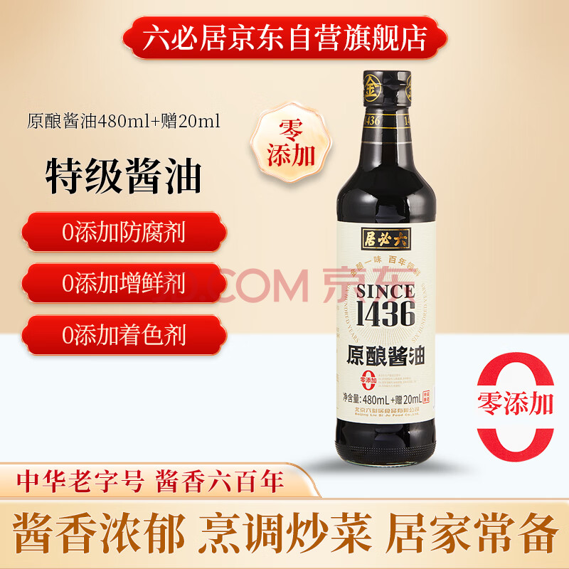 商品相册:六必居原酿酱油【0添加 特级酱油】480ml加赠20ml 老字号 点蘸凉拌生抽第