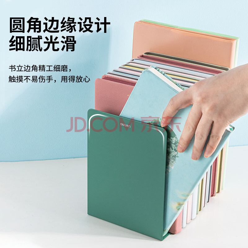 商品相册:得力(deli)18cm高简约金属桌面桌面书立置物架书收纳桌上书架 桌上书籍挡靠夹 2片/ 绿色78650第