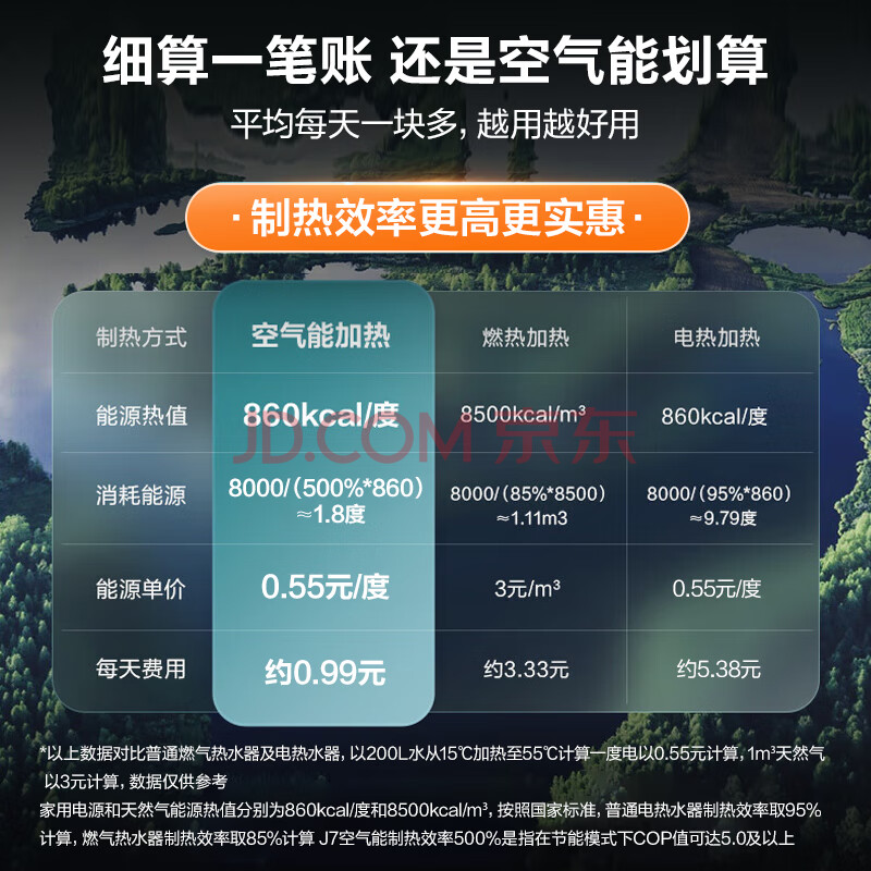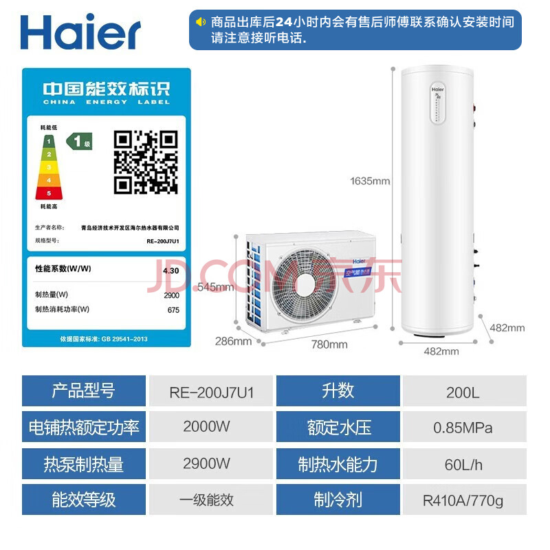商品相册:海尔(Haier)空气能热水器200升包安装 超一级能效电辅80℃杀菌洗双变频超级节能效率500%京东小家 J7(4-6人)第