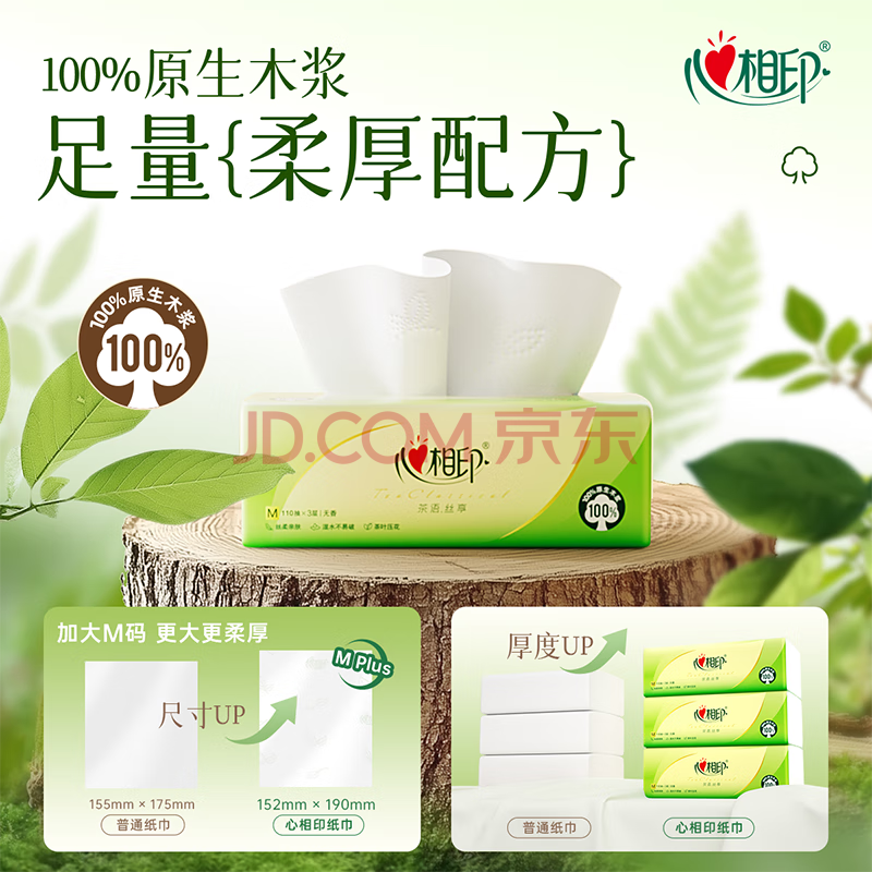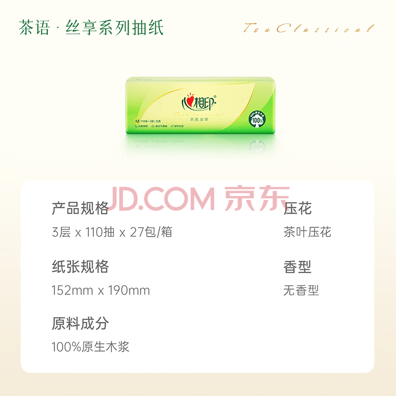 商品相册:心相印抽纸 面巾纸 茶语丝享 3层110抽*27包真M码 纸巾(整箱销售)第