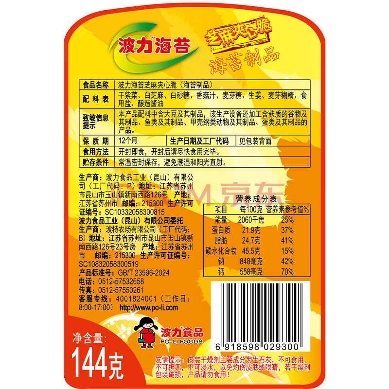 商品相册:波力海苔脆片儿童休闲零食即食紫菜芝麻夹心脆罐装144克(约72包)第
