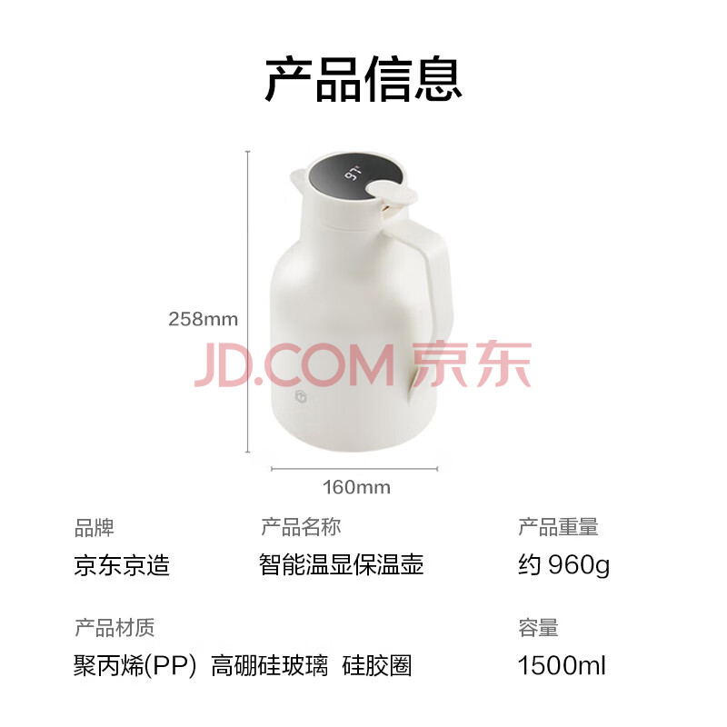 商品相册:京东京造保温壶 智能温显大容量玻璃内胆热水壶暖壶宿舍办公炼乳白1.5L第