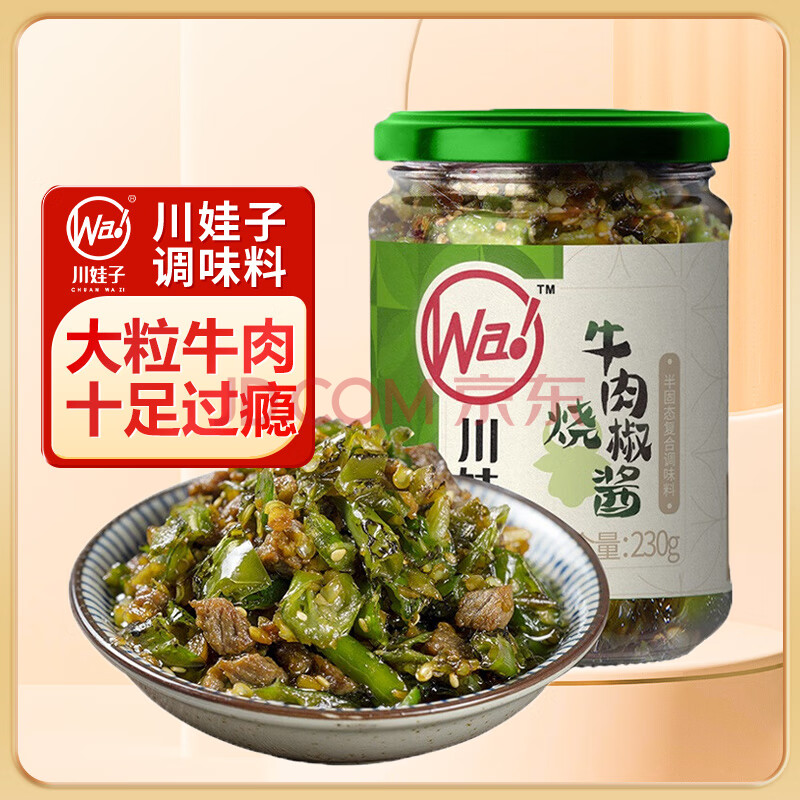 商品相册:川娃子调味料 烧椒牛肉酱 下饭菜拌饭拌面酱 辣椒酱 辣酱 调味酱230g第