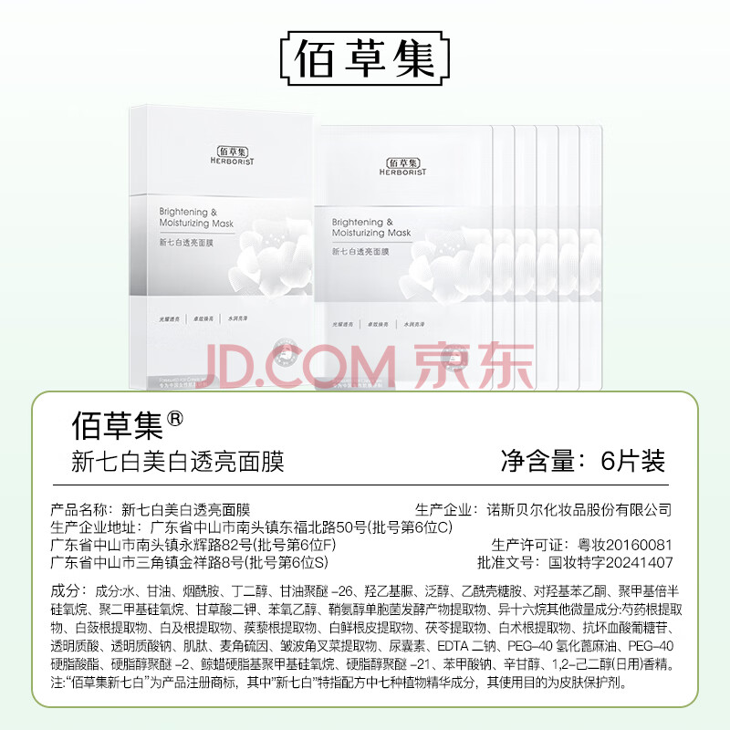 商品相册:佰草集【2.0美白特证】新七白奶皮补水面膜6片祛斑黄提亮礼物男女第