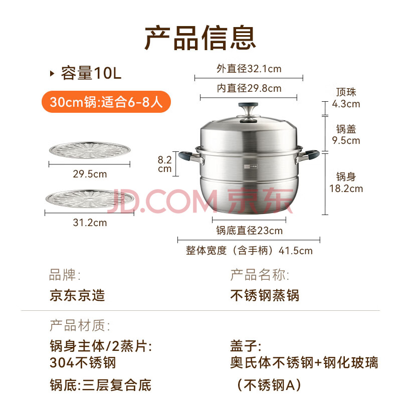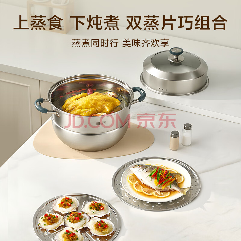 商品相册:京东京造 蒸锅 大容量304不锈钢汤锅加厚炖蒸煮燃气灶家用 双层30cm第1张/共9