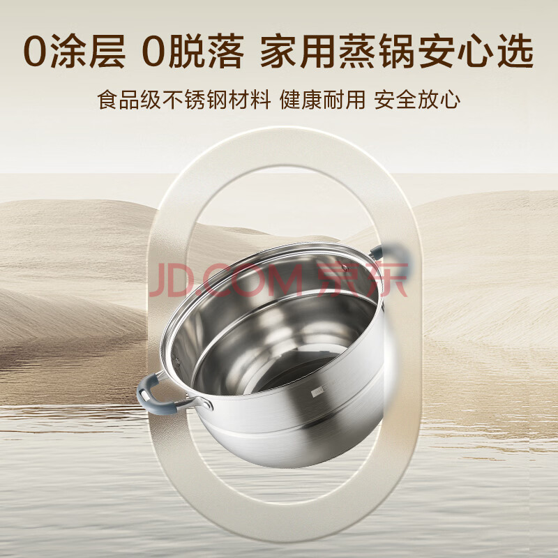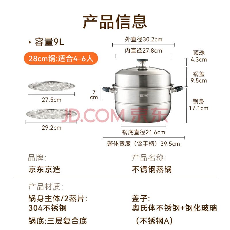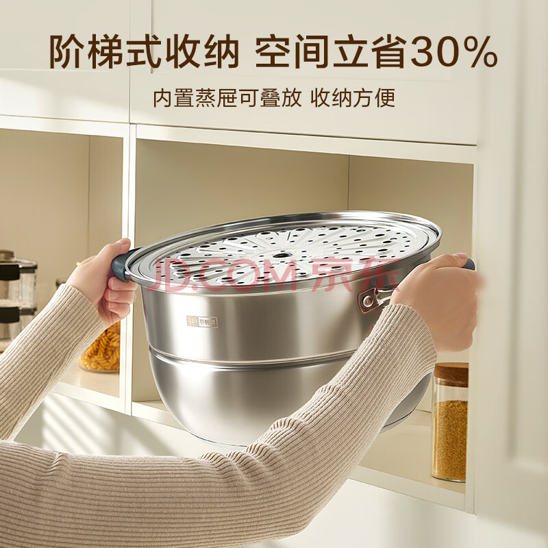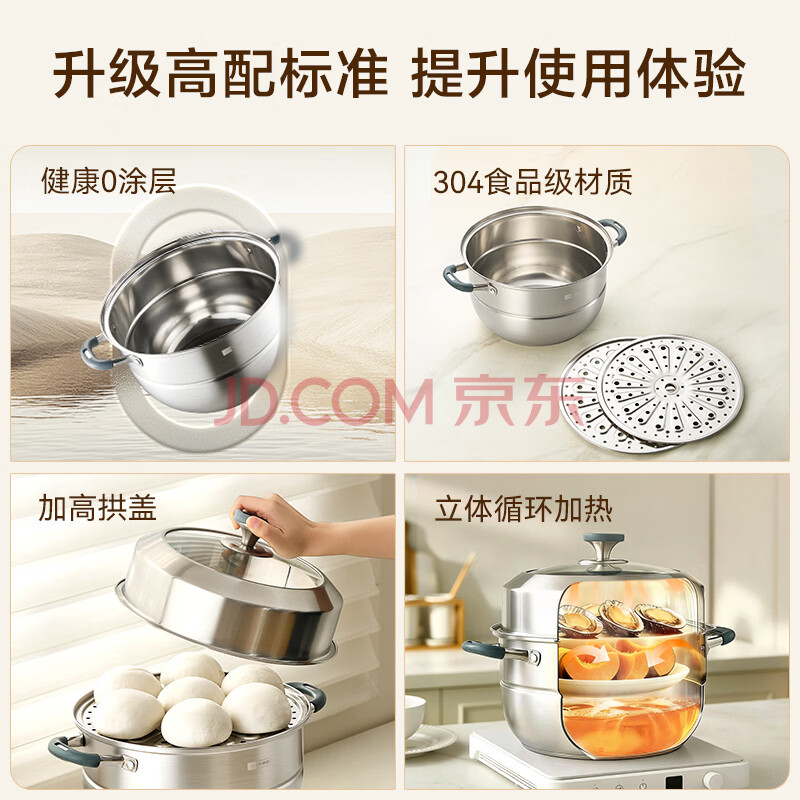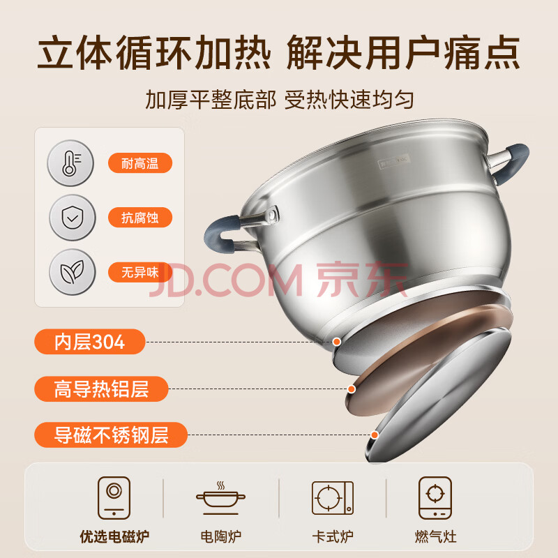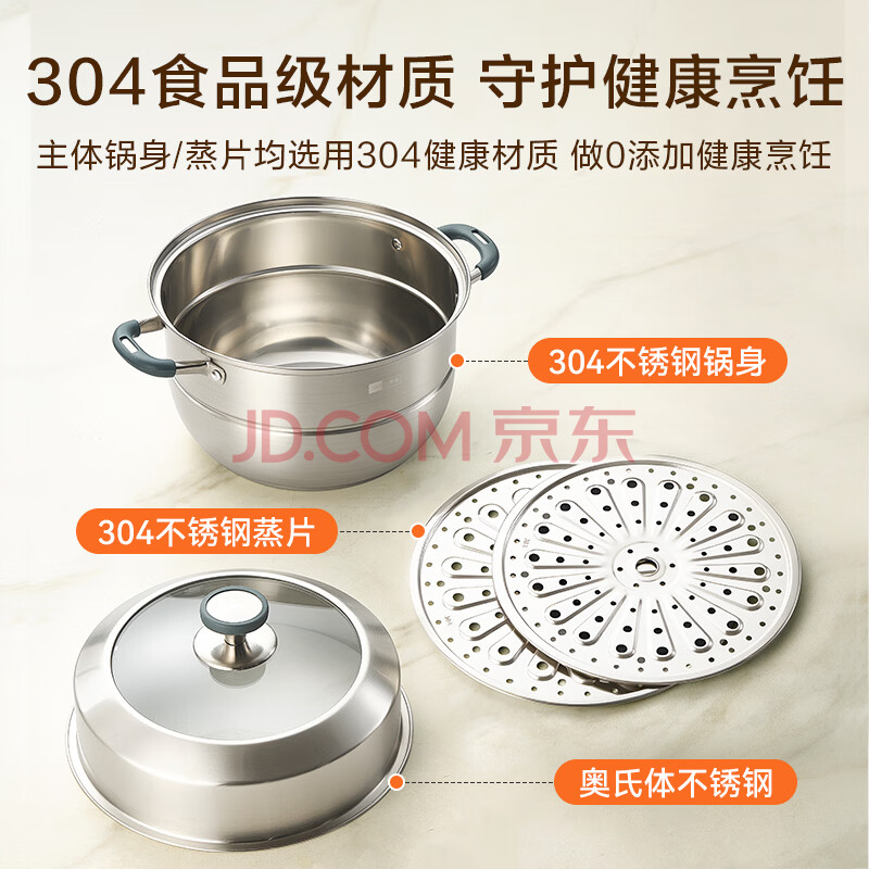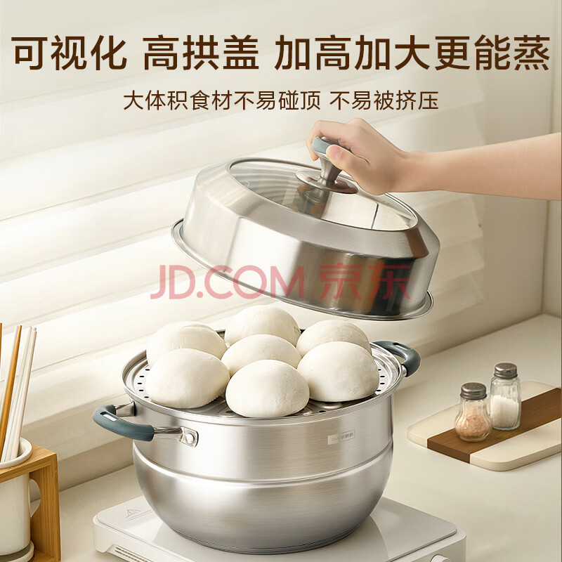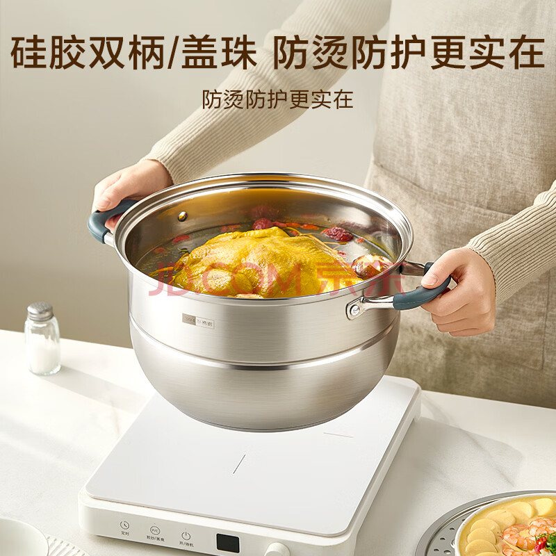 商品相册:京东京造 蒸锅 大容量304不锈钢汤锅加厚炖蒸煮燃气灶家用 双层28cm第