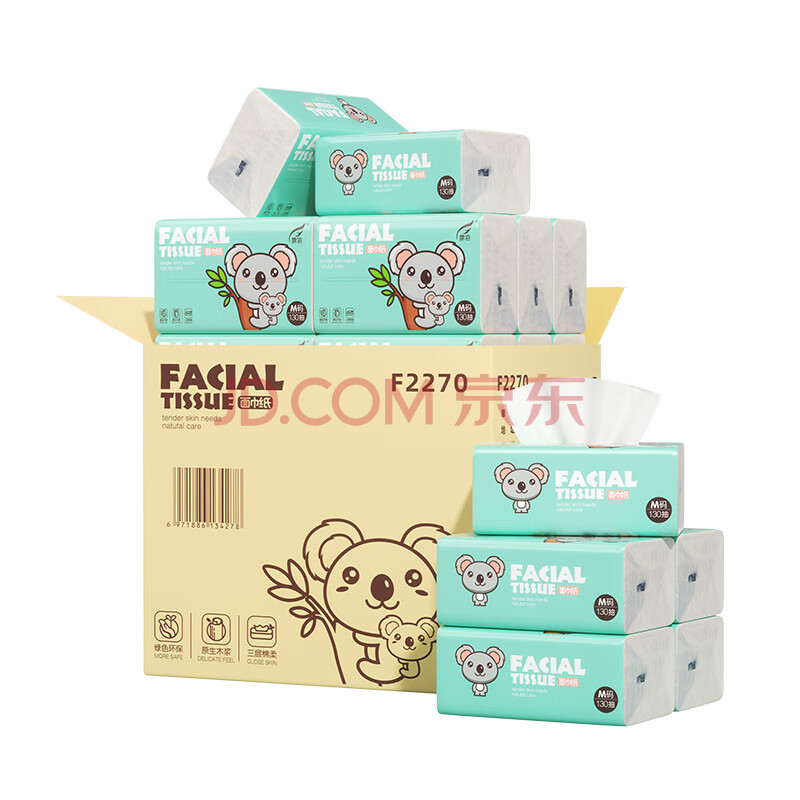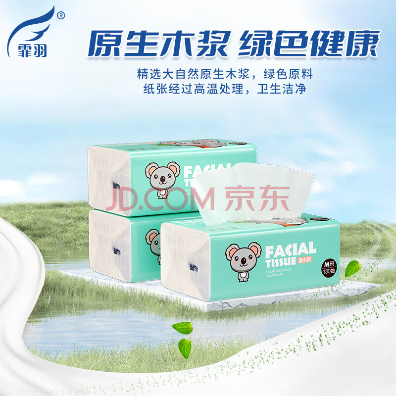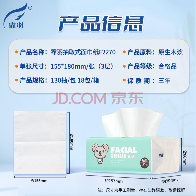 商品相册:霏羽抽纸3层130抽*18包加大号餐巾纸家用原木浆卫生纸巾面巾纸F2270第