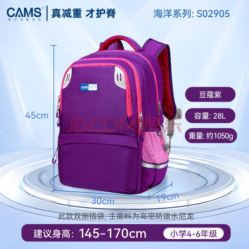 商品相册:CAMS悬浮减重书包四到六年级减负护脊初中生轻便书包女 豆蔻紫 S02905第1张/共4