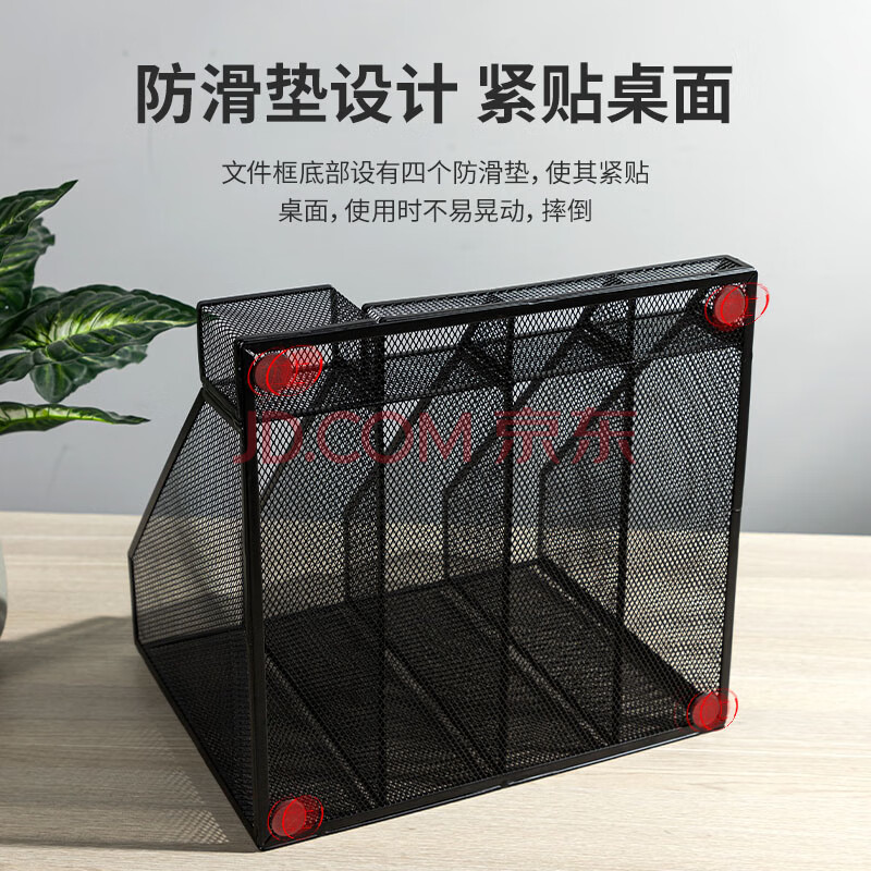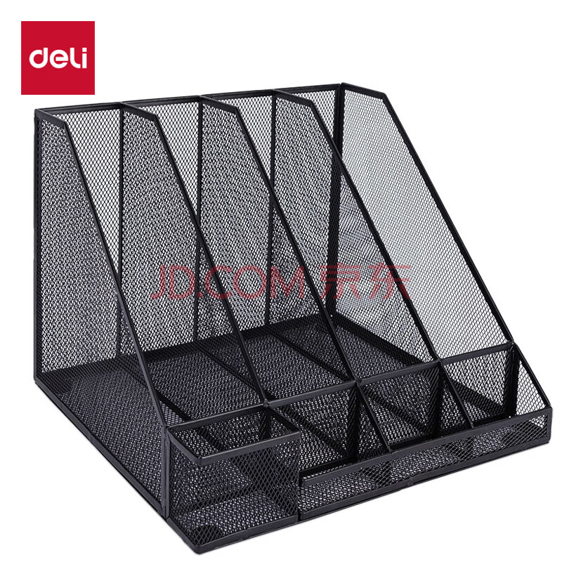 商品相册:得力(deli)四联带笔筒金属文件框栏书立架 办公室桌面档案收纳盒多层资料架子网状镂空文件置物架 黑色78988第1张/共5