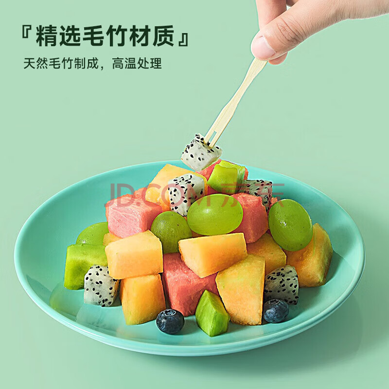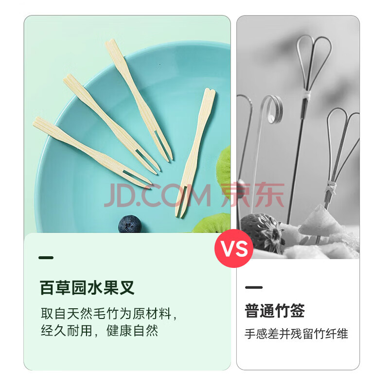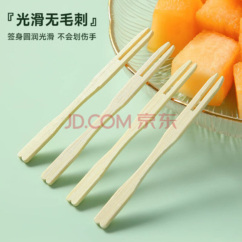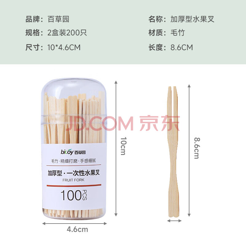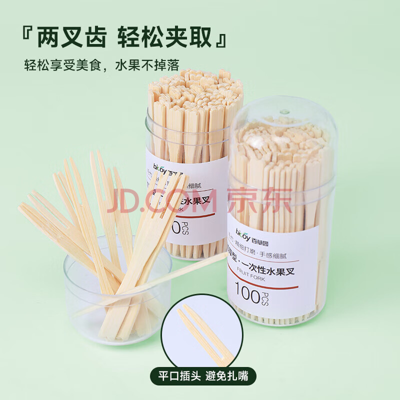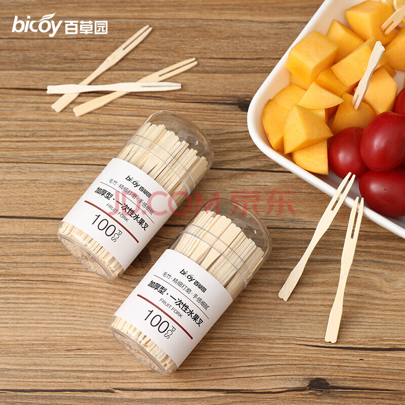 商品相册:百草园水果叉一次性叉子加厚型竹制叉子2筒装200支卫生蛋糕点心叉水果签第1张/共9