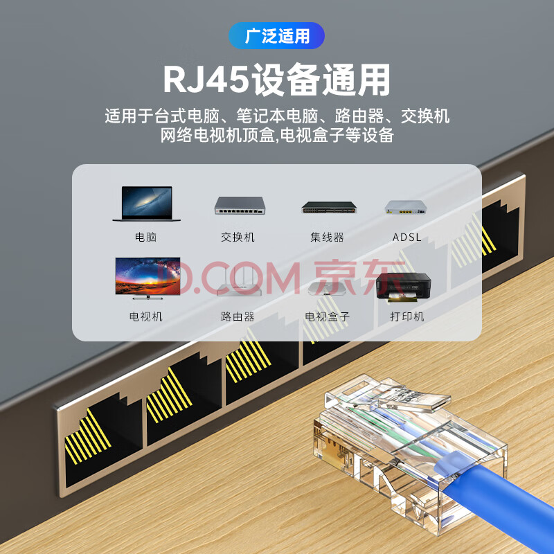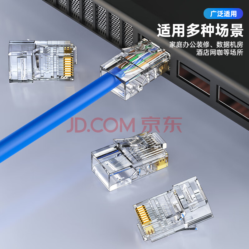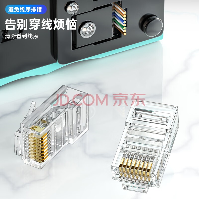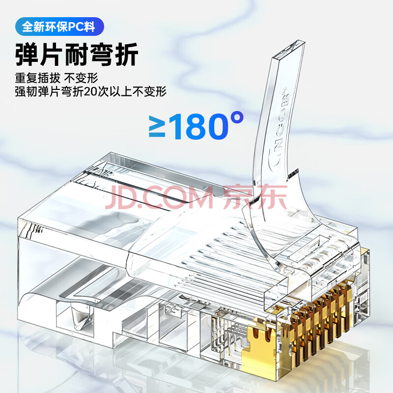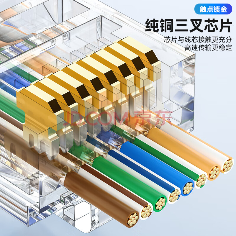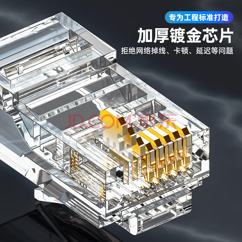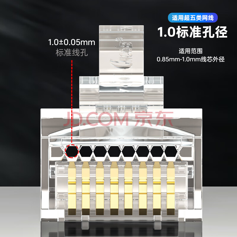 商品相册:CNCOB超五类穿孔式水晶头非屏蔽通孔千兆rj45网线接头8P8芯纯铜镀金超5类水晶头 100颗/盒 第