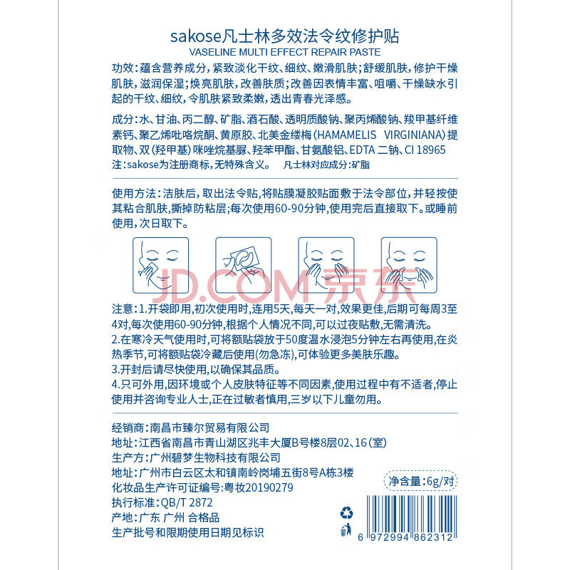 商品相册:sakose凡士林紧致抗皱法令纹贴2盒12对淡化修护抬头纹八字纹皱纹面膜贴第