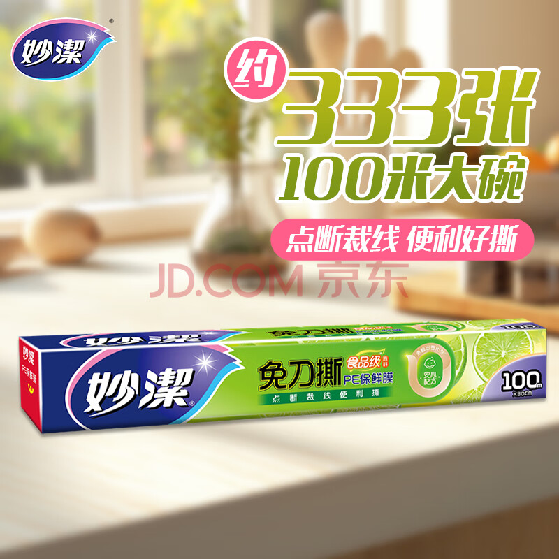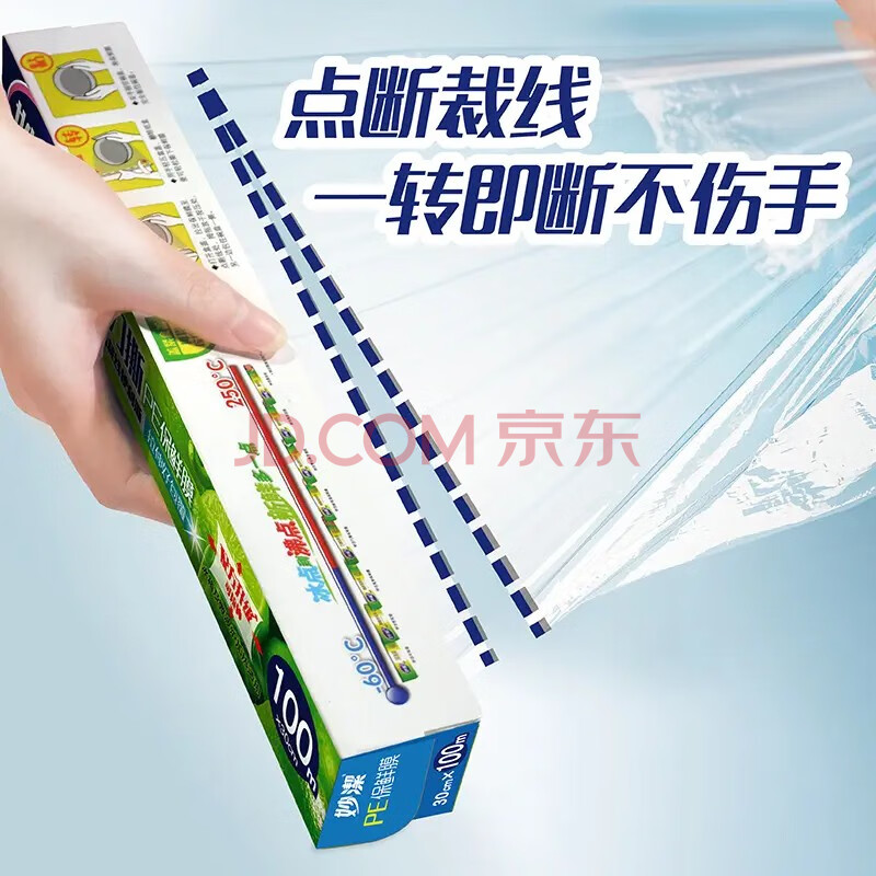 商品相册:妙洁 免刀撕PE保鲜膜 盒装 易拉点断易撕粘性强 大号100米第1张/共8