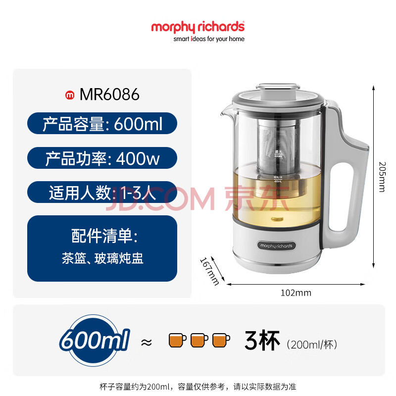 商品相册:摩飞电器(Morphyrichards)养生壶便携煮茶器烧水壶养生杯小型办公室家用多功能煮茶壶一体热水壶0.6L MR6086 白第