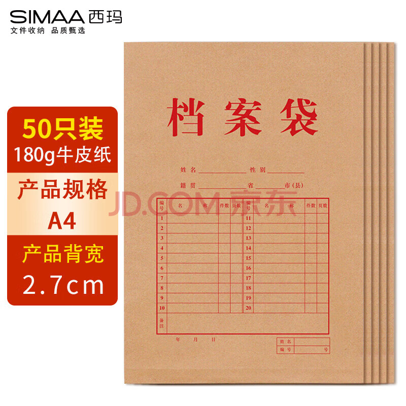 商品相册:西玛(SIMAA)50只A4牛皮纸档案袋180g加厚 侧宽2.7cm文件袋/资料袋/办公用品 6091第