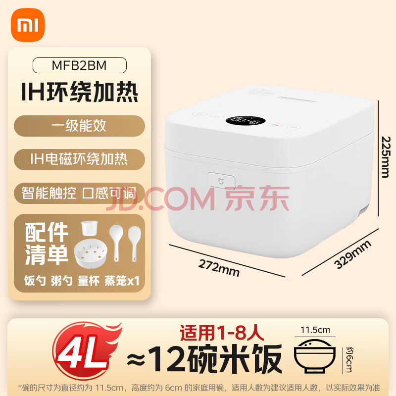 商品相册:米家小米电饭煲家用3-4个人 智能微压IH多功能电饭锅煮饭锅煮粥锅 厚釜内胆不粘锅 一级能效 带蒸笼4升第