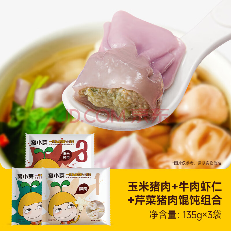 商品相册:窝小芽一周营养小馄饨组合405g(玉米猪肉+牛肉虾仁+芹菜猪肉)儿童早餐第