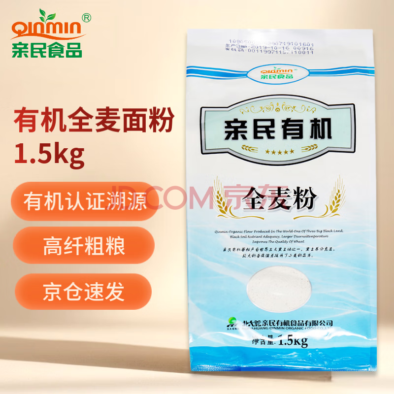 商品相册:亲民食品北大荒有机全麦面粉3斤 含麸皮小麦粉粗粮健康原料早餐第