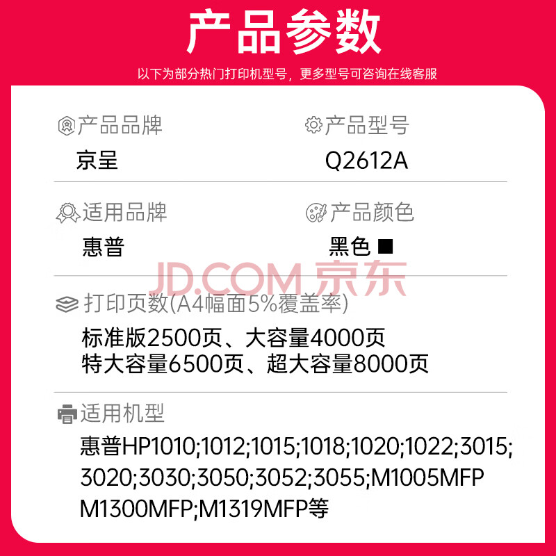 商品相册:京呈12a硒鼓适用惠普m1005 hp1020/plus硒鼓 1010 1018 打印机墨盒3015 3050佳能3000 LBP2900墨粉碳粉6瓶第